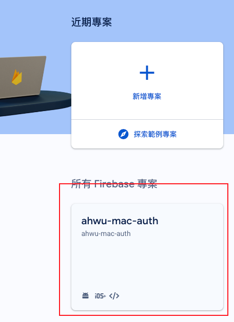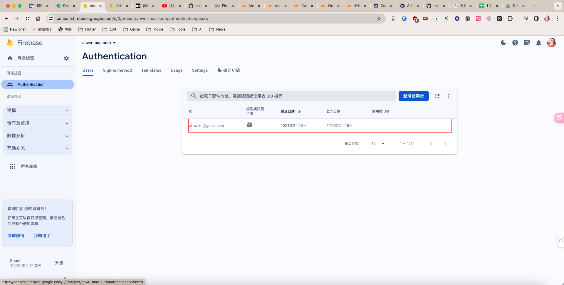 • 在FireBase網站也可以看到有註冊訊息