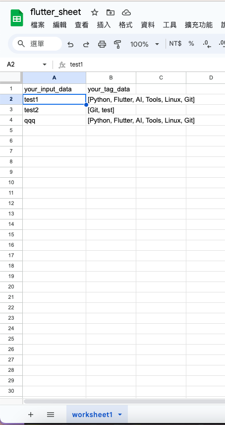 sheet_id是 Google Sheets 的 ID,用於確定要寫入的目標工作表。sheet_name是工作表的名稱。request是函數接收到的網絡請求對象,其中包含了從客戶端發送的參數。input是從請求中獲取的一個參數,它是要寫入表格的輸入值。tag是另一個從請求中獲取的參數,它是與輸入值相關的標簽。sheet.appendRow([input, tag])將輸入值和標簽寫入指定的工作表。ContentService.createTextOutput(input,tag)創建一個文本輸出,其中包含了輸入值和標簽。