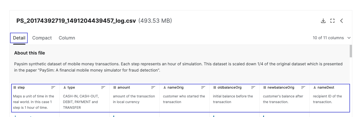 為了使用機器學習來識別線上支付詐騙,我們需要訓練一個機器學習模型,用於區分詐騙和非詐騙支付。為此,我們需要一個包含有關線上支付詐騙資訊的資料集,以便了解哪些交易類型容易導致詐騙行為。為此任務,我從Kaggle收集了一個資料集,其中包含有關詐騙交易的歷史資訊,可用於檢測線上支付詐騙。以下是我在這裡使用的資料集中的所有欄位: