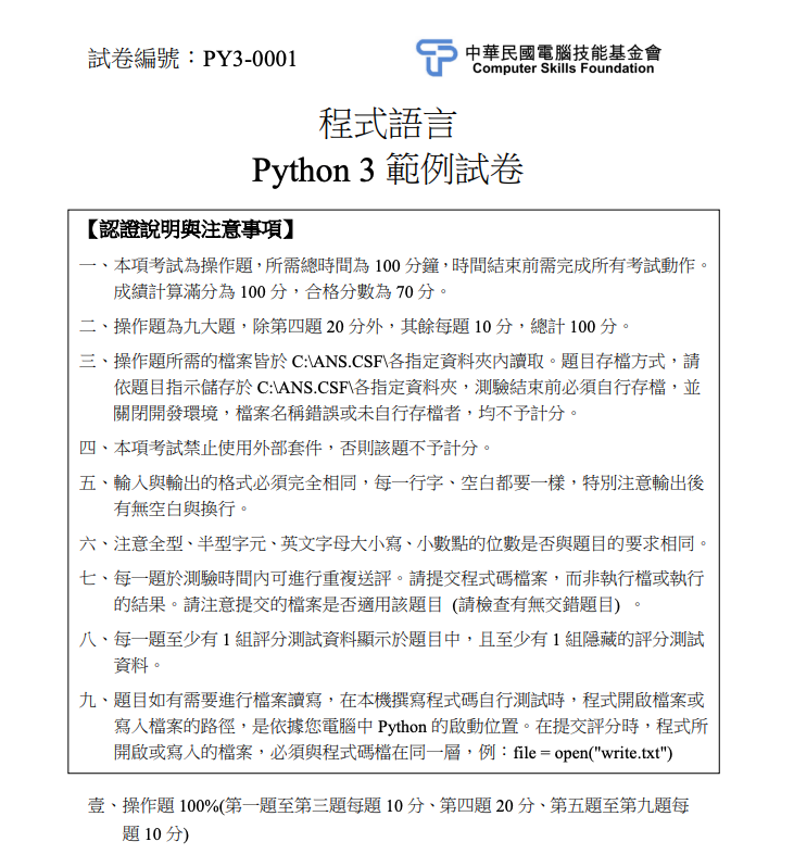 TQC+ Python3 考試注意事項¶ 考前一定要看 https://www.tqcplus.org.tw/CertificateDetail.aspx?CODE=y/zEfkGeQhM%3D 考試規範 本認證為操作題,總分為100分。 操作題為第一至九類各考一題共九大題,除第四題20分外,其餘每題10分,總計100分。 於認證時間100分鐘內作答完畢,成績加總達70分(含)以上者該科合格。 考試細節 考試使用Spyder軟體 考試說明事項中有提到 操作題所需的檔案皆於 C:\ANS.CSF\各指定資料夾內讀取。題目存檔方式,請依題目指示儲存於 C:\ANS.CSF\各指定資料夾,測驗結束前必須自行存檔,並關閉開發環境,檔案名稱錯誤或未自行存檔者,均不予計分。 考試前幾分鐘考場才會把電腦桌面轉入考試環境(尚未開始考試) 時間到才可以開始 有剩餘時間提示 每題可以重複送評 當天考完當天知道過了沒 證書要等一個月後才能回考試場地拿取(各自拿取) 考試心得相關 TQC+ Python檢定心得 TQC+ Python Youtube Last update : 13 novembre 2024 Created : 13 novembre 2024 Comments Comments